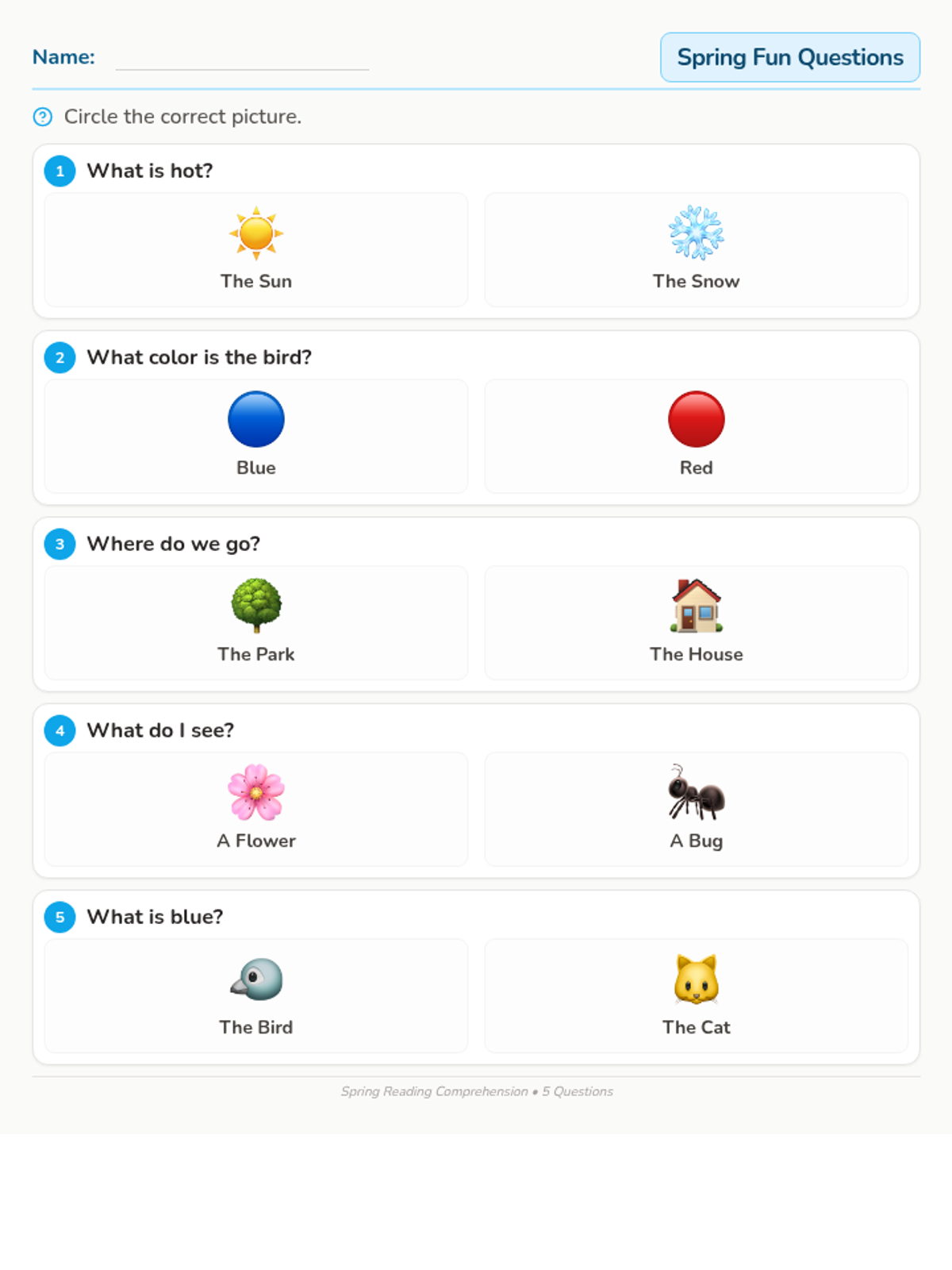 An expanded set of 5 visual WH- comprehension questions corresponding to the Spring Fun passage, using high-contrast icons and large text for accessible response selection.