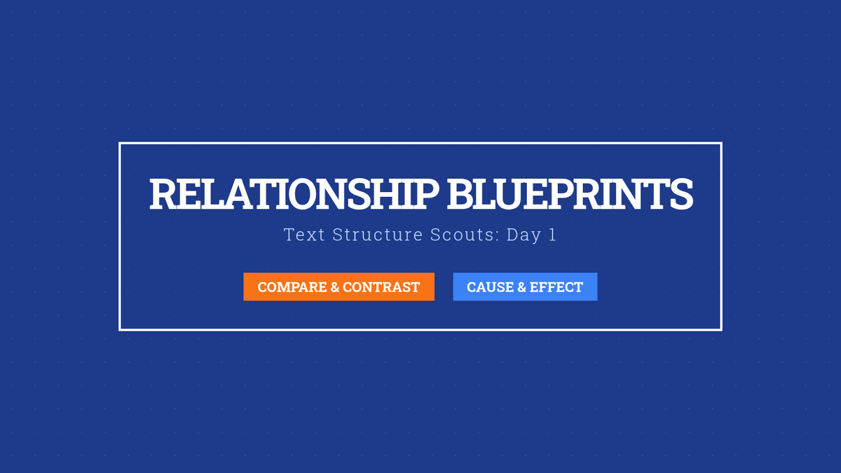 A visual presentation introducing students to Compare & Contrast and Cause & Effect text structures with signal words, graphic organizers, and practice examples.