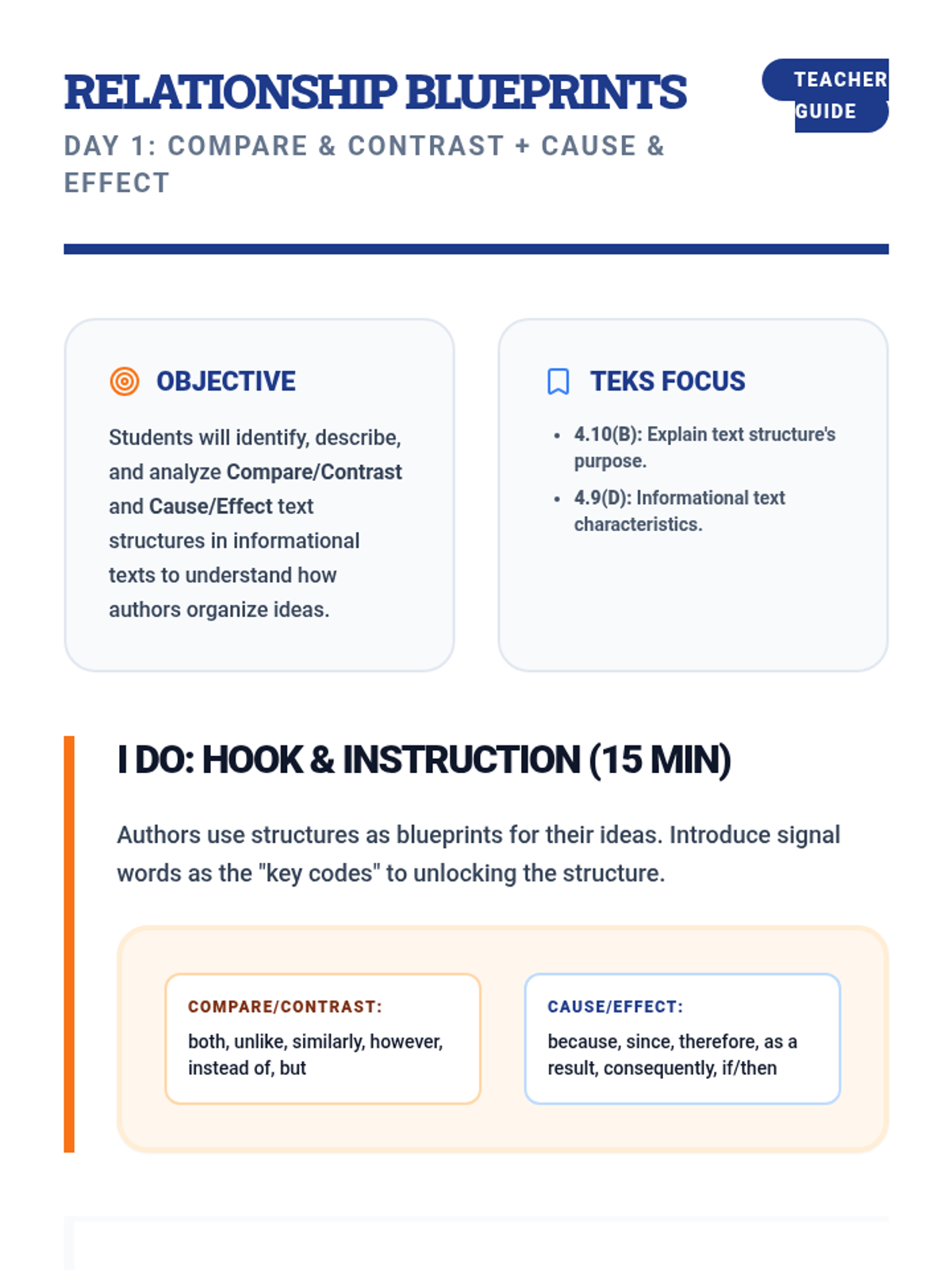 A comprehensive lesson plan for Day 1, covering teaching procedures, instructional hooks, and differentiation strategies for text structure analysis.