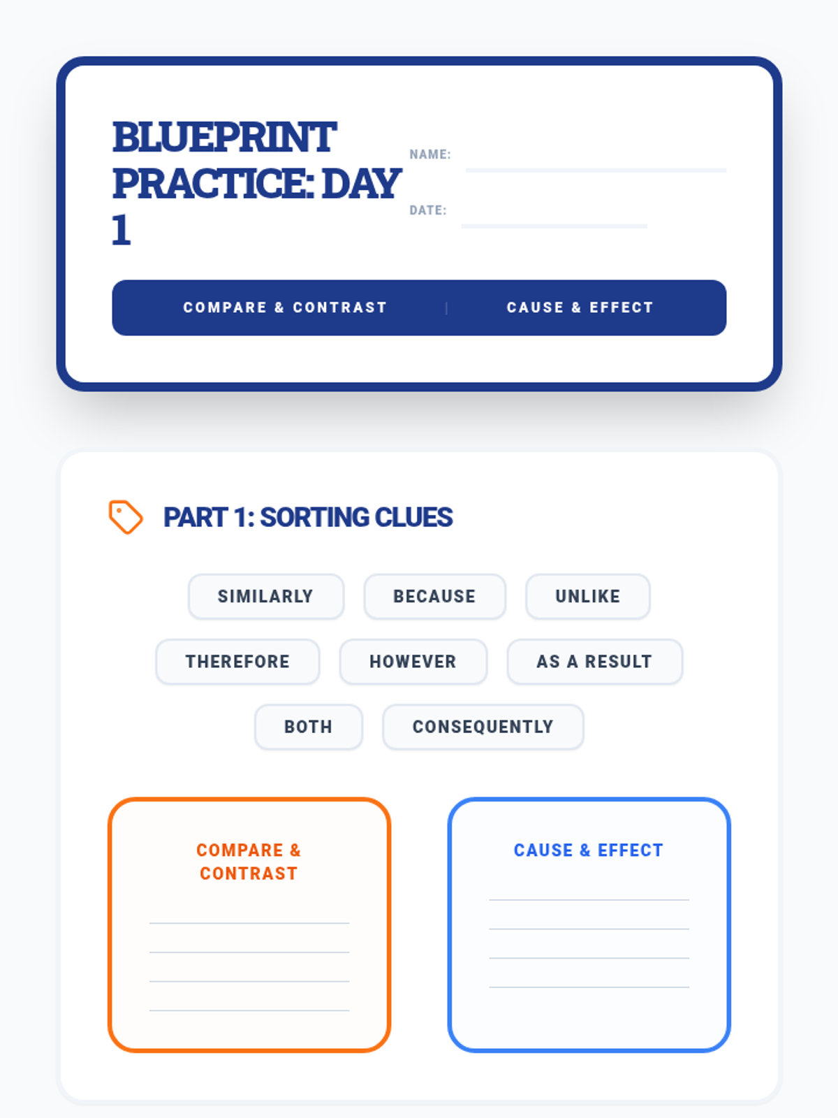 A guided practice worksheet focusing on identifying Compare/Contrast and Cause/Effect structures through signal word sorting and paragraph analysis.