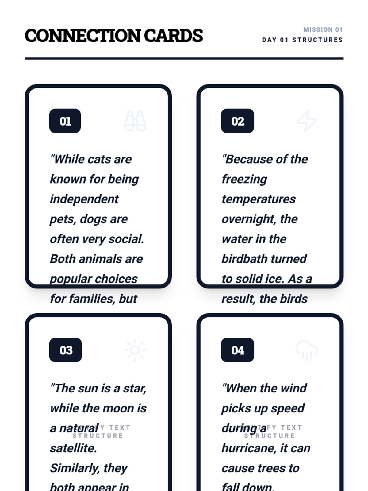 A set of four task cards for center activities, featuring short paragraphs for students to identify Compare/Contrast and Cause/Effect structures.