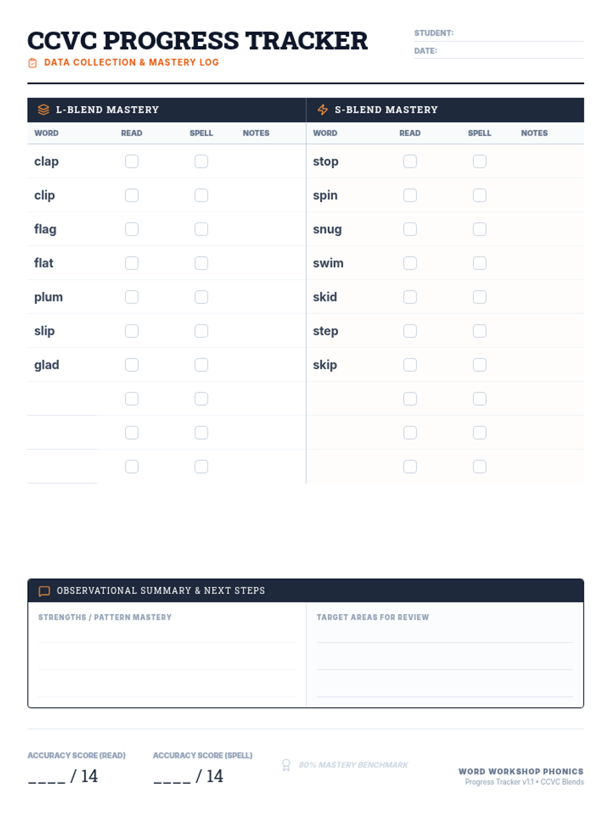 A simple, structured data tracking sheet for educators to monitor student progress in reading and spelling CCVC words with L and S blends. Includes mastery checkboxes and space for observational notes.