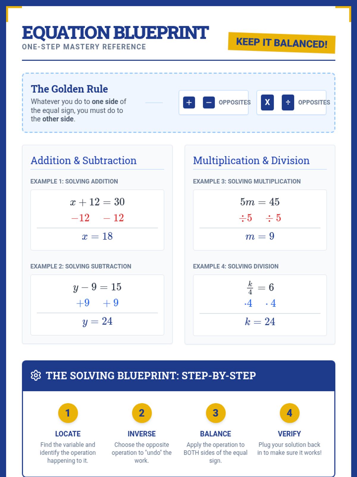 A comprehensive one-page reference sheet for solving one-step equations, featuring visual examples of addition, subtraction, multiplication, and division along with a 4-step graphic organizer.