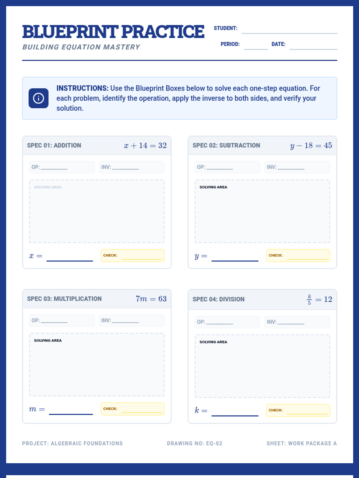 A two-page practice worksheet with 'blueprint' solving boxes that guide students through the steps of identifying operations, applying inverses, and checking their work.