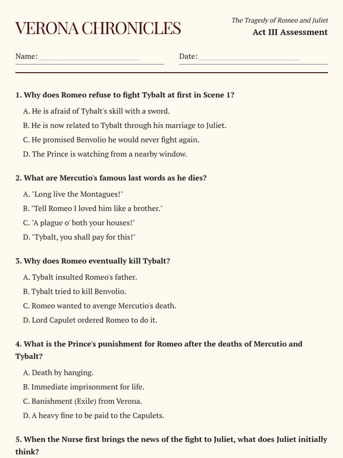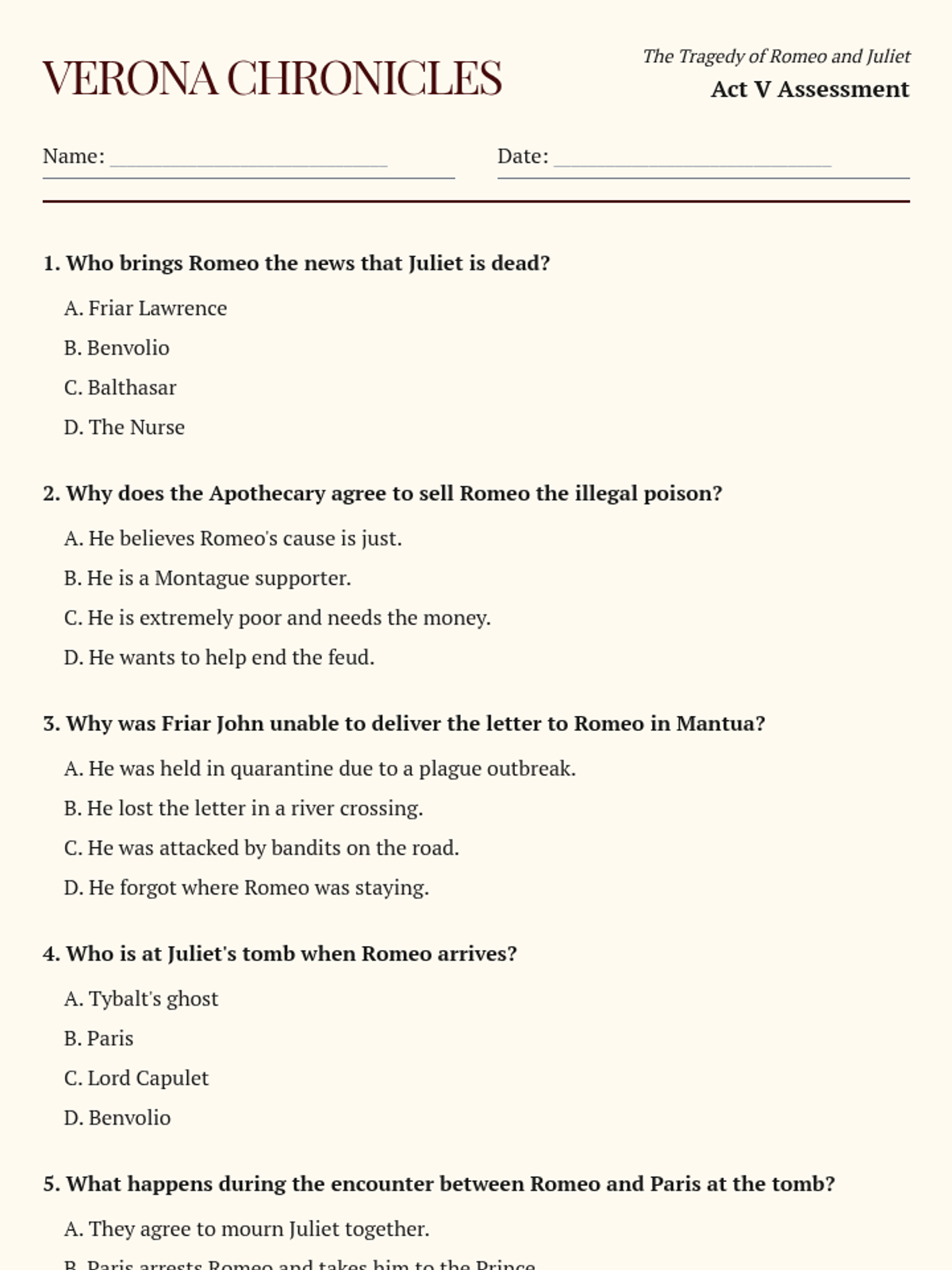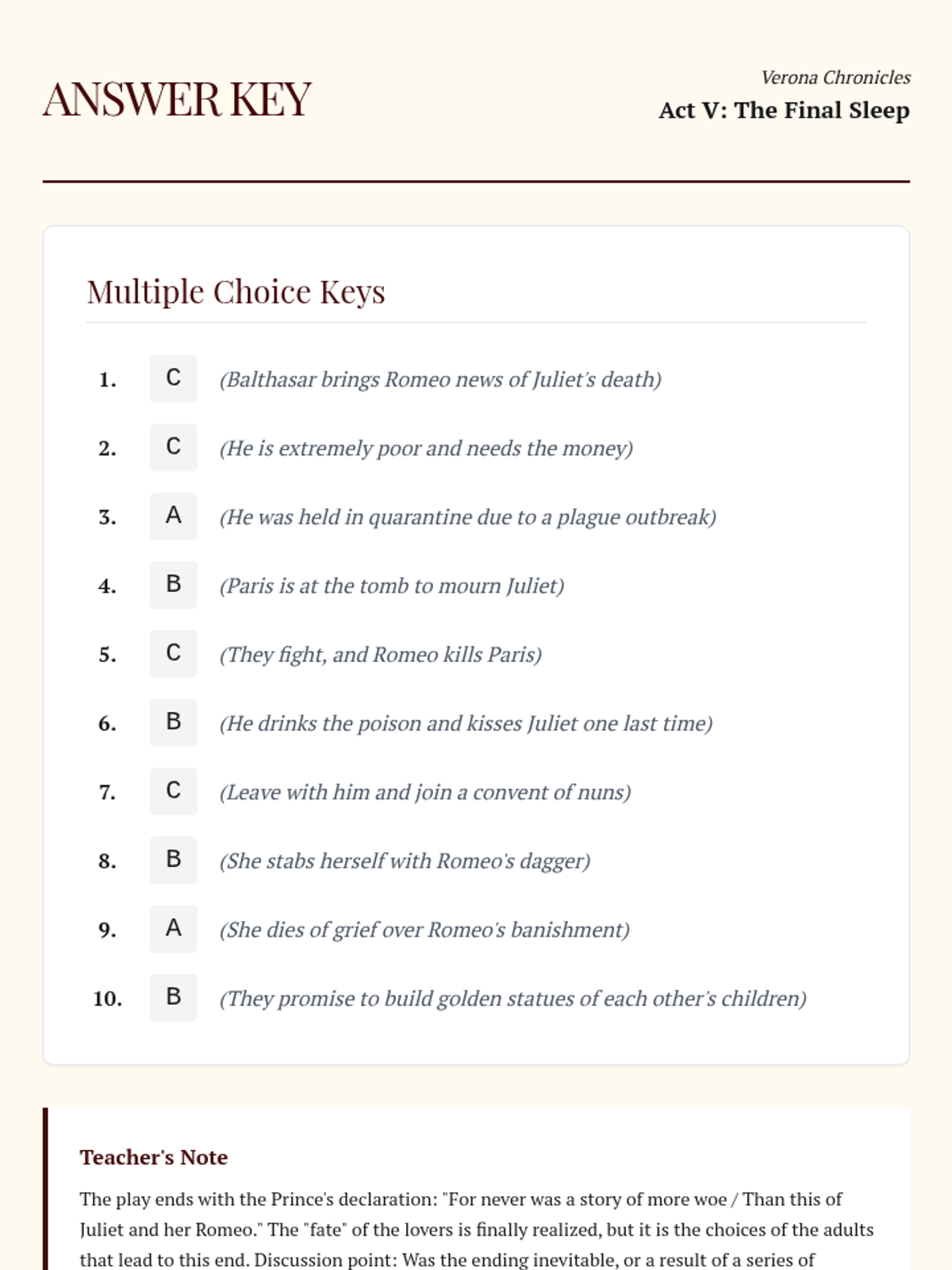 A 10-question multiple-choice quiz covering the tragic conclusion of Act 5 and the final resolution of the play. Revised for improved page-break stability and visual clarity.