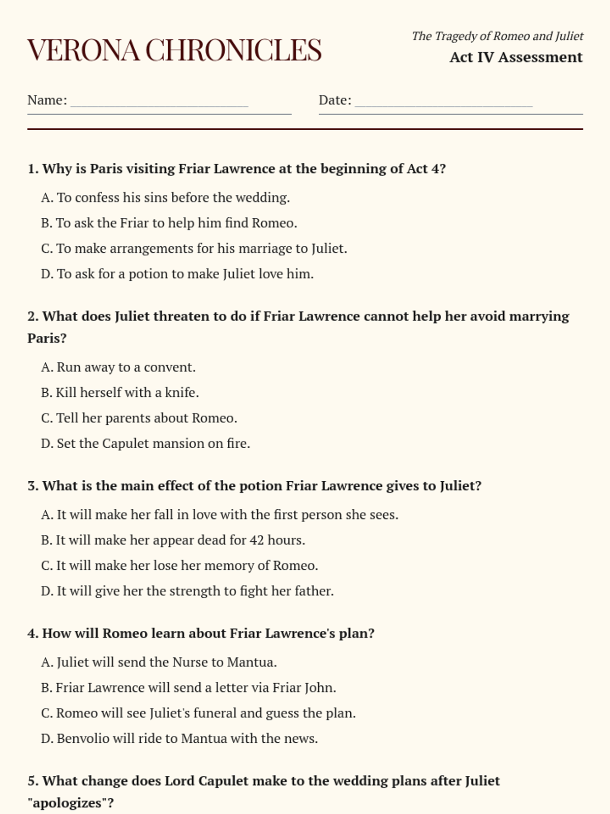 A 10-question multiple-choice quiz covering the suspenseful events of Act 4, including Friar Lawrence's plan and Juliet's faked death. Revised for improved page-break stability and visual clarity.