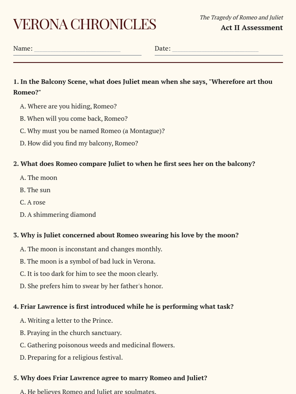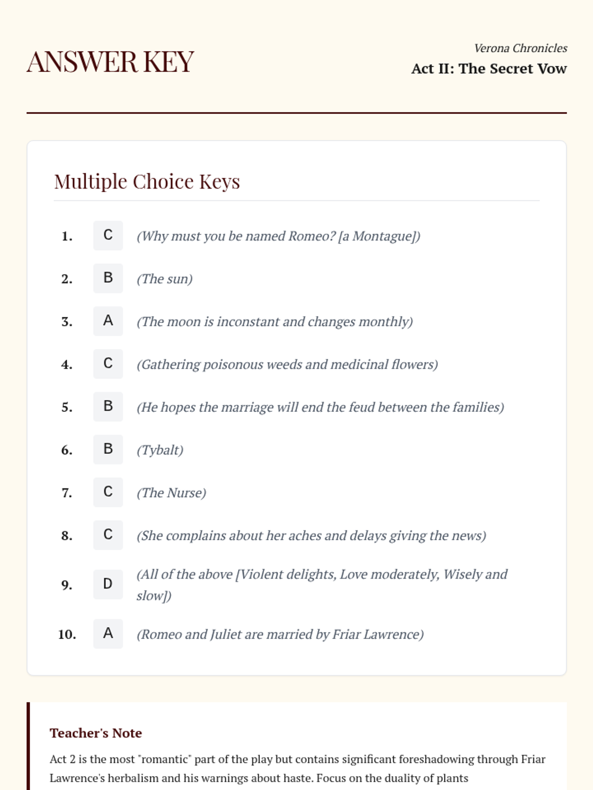 Teacher answer key for the Act 2 Quiz of Romeo and Juliet. Revised for content completeness and page-break optimization.
