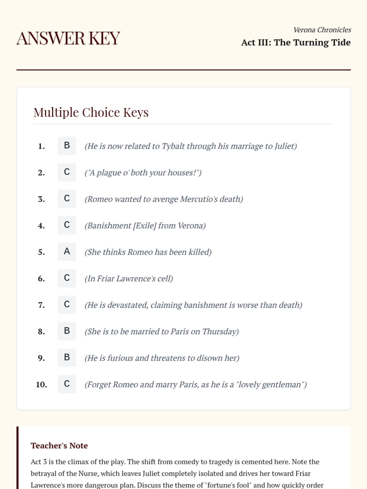 Teacher answer key for the Act 3 Quiz of Romeo and Juliet. Revised for content completeness and page-break optimization.