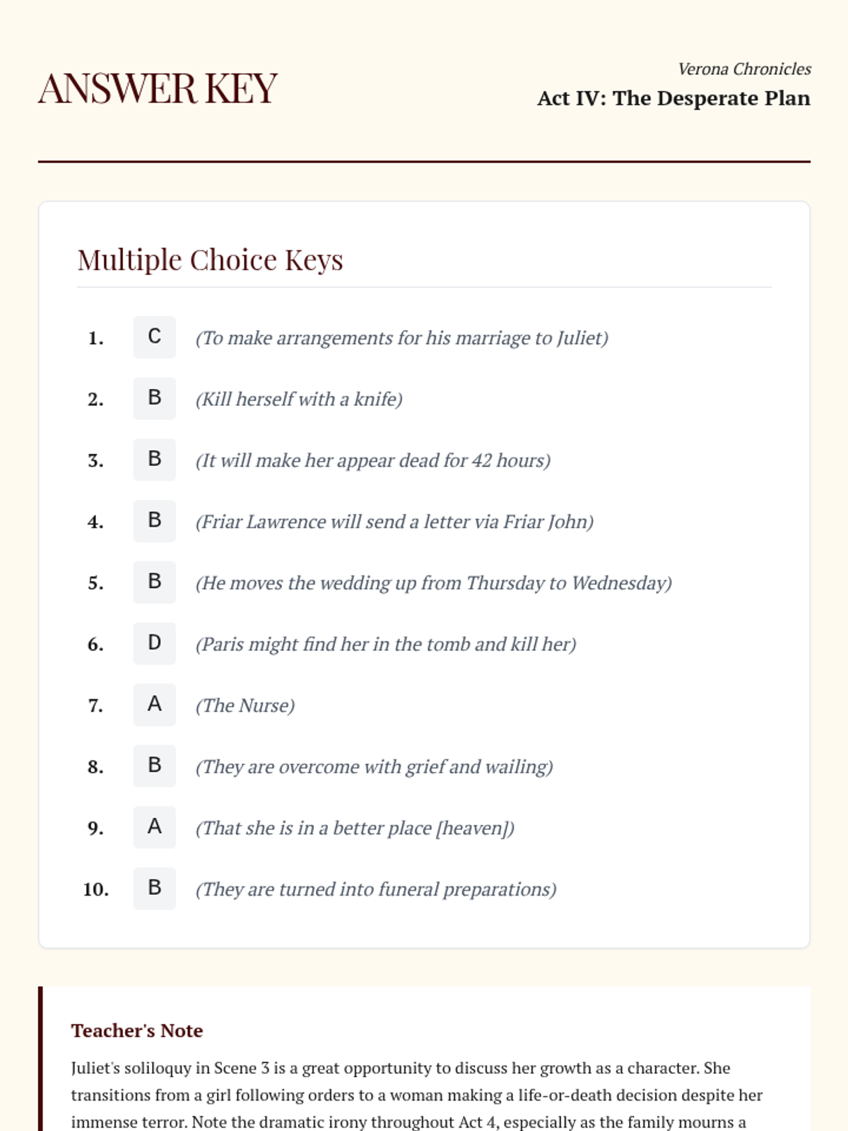 Teacher answer key for the Act 4 Quiz of Romeo and Juliet. Revised for content completeness and page-break optimization.