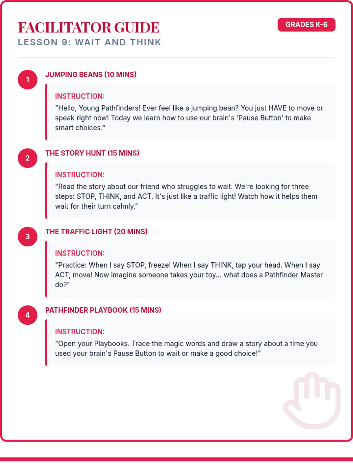 Facilitator script and student workbook for the Impulsive Ninja lesson. Revised for single-page workbook layout, improved tracing activity, and script integrity.