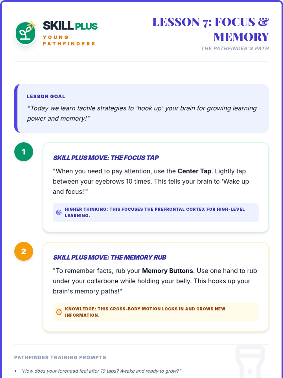 Facilitator script and student workbook for the Focused Ninja lesson. Revised for single-page workbook layout, larger writing targets, and script integrity.