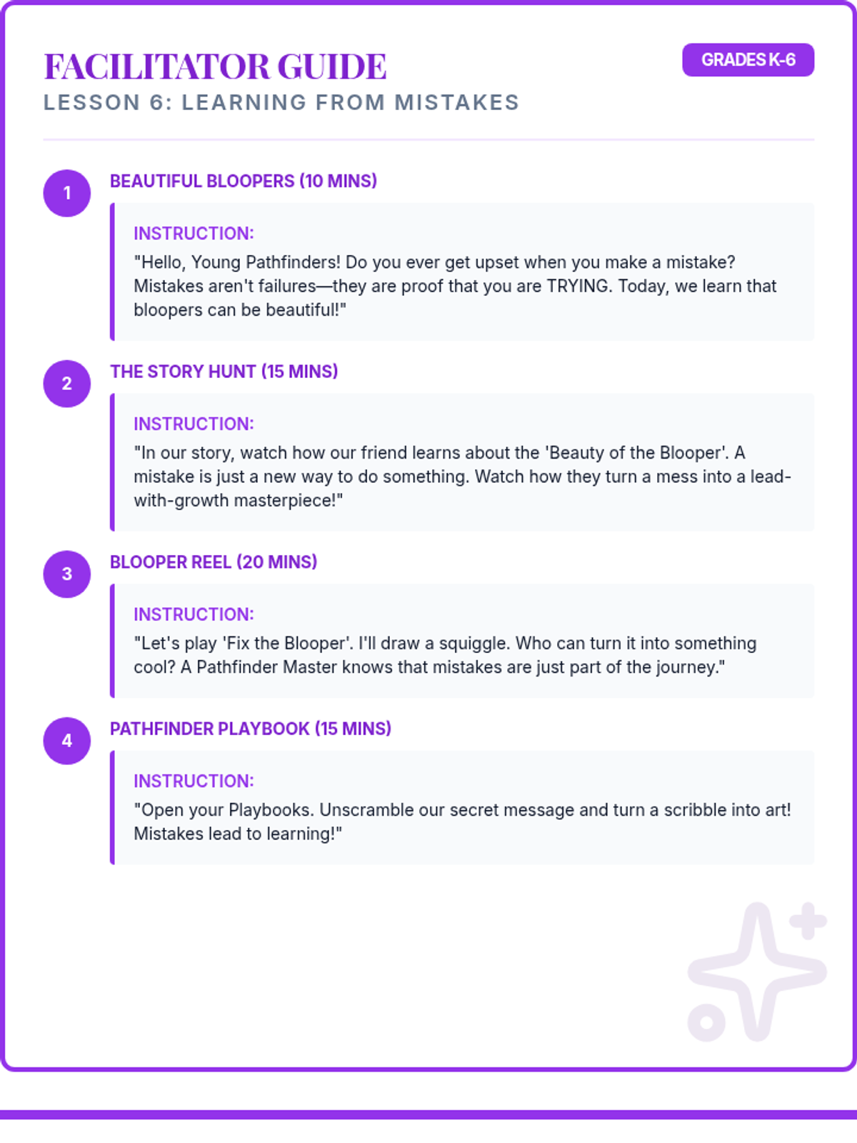 Facilitator script and student workbook for the Perfectionist Ninja lesson. Revised to fix scrambled activity, fit workbook on one page, and ensure script integrity.