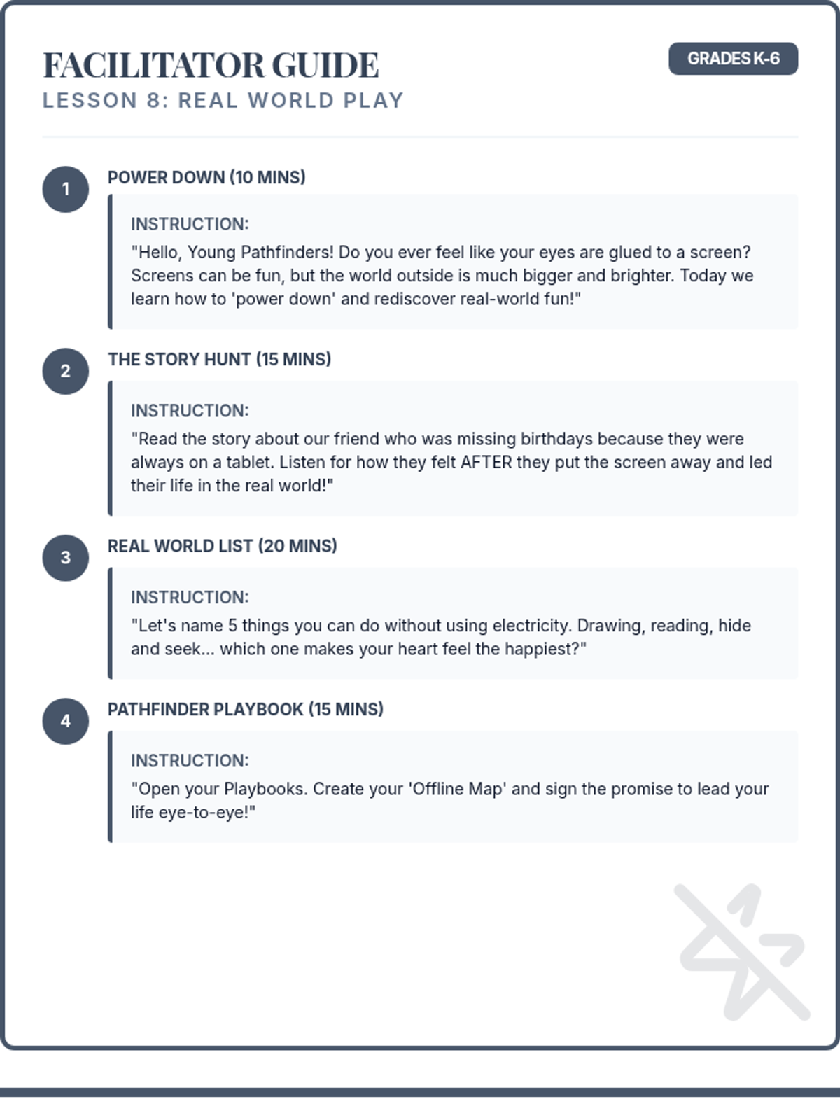 Facilitator script and student workbook for the Unplugged Ninja lesson. Revised for page-break consistency, single-page handout design, and fixed name/date fields.