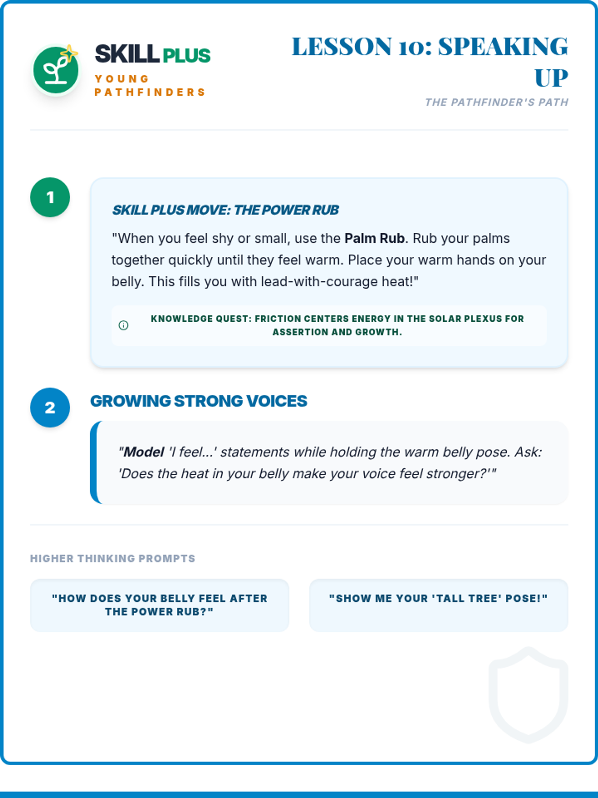 Facilitator script and student workbook for the Self-Assertive Ninja lesson. Revised for single-page workbook layout, wider shield activity, and script integrity.