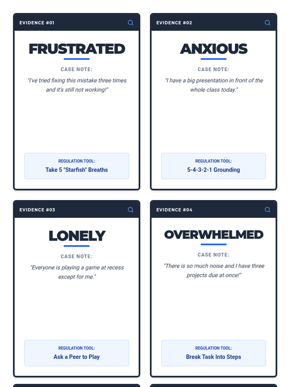 A set of printable charades cards designed with a detective theme, each featuring an emotion, a relatable scenario, and a unique evidence number.