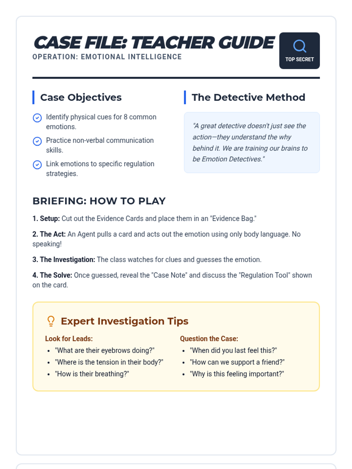 A teacher-facing guide for the Emotion Detectives activity, including lesson objectives, game instructions, and a master key of emotions and regulation strategies.