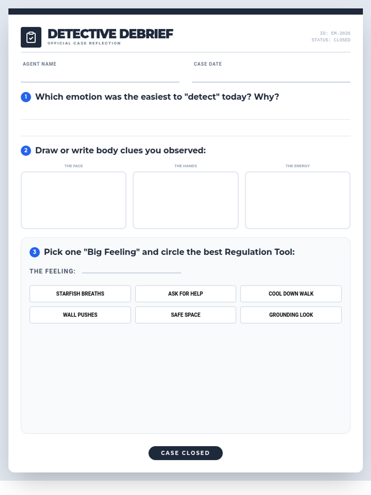 An exit ticket for the Emotion Detectives lesson where students reflect on the charades game, identify body clues they observed, and select appropriate regulation tools.