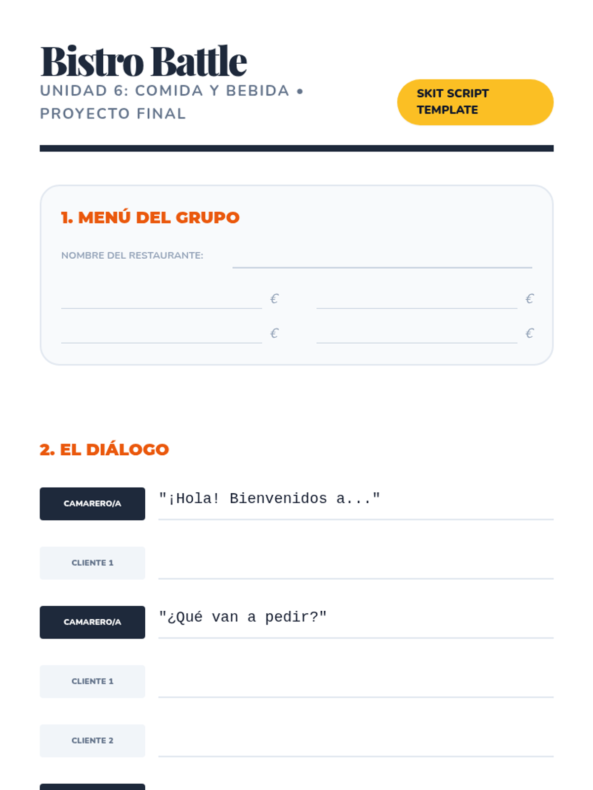 Master Teacher Guide for Unit 6 (Food and Drink). Includes answer keys for all worksheets, detailed grammar notes on contractions (comparing to Italian/French), and a scoring guide for the summative restaurant skit.