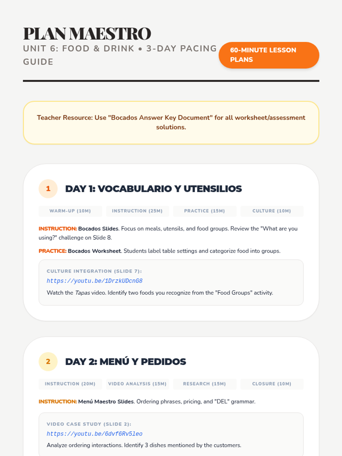 Detailed three-day lesson plan for the Unit 6 Food and Drink unit. Each day is structured into 60-minute blocks with warm-ups, direct instruction, guided practice, and independent work, aligning with the provided materials.
