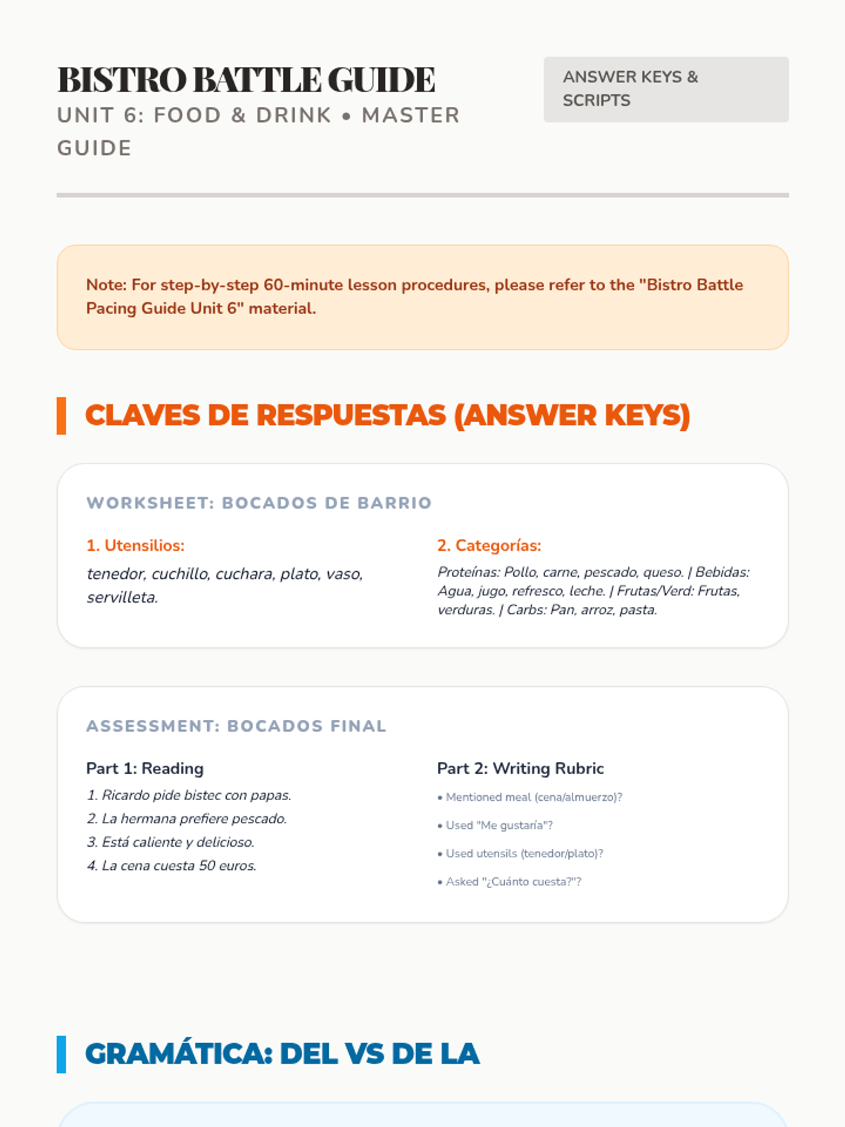 Teacher-facing resource for the 'Barrio Beats' unit. Includes the listening assessment script, answer keys for all student materials, and instructional tips for pacing and differentiation.