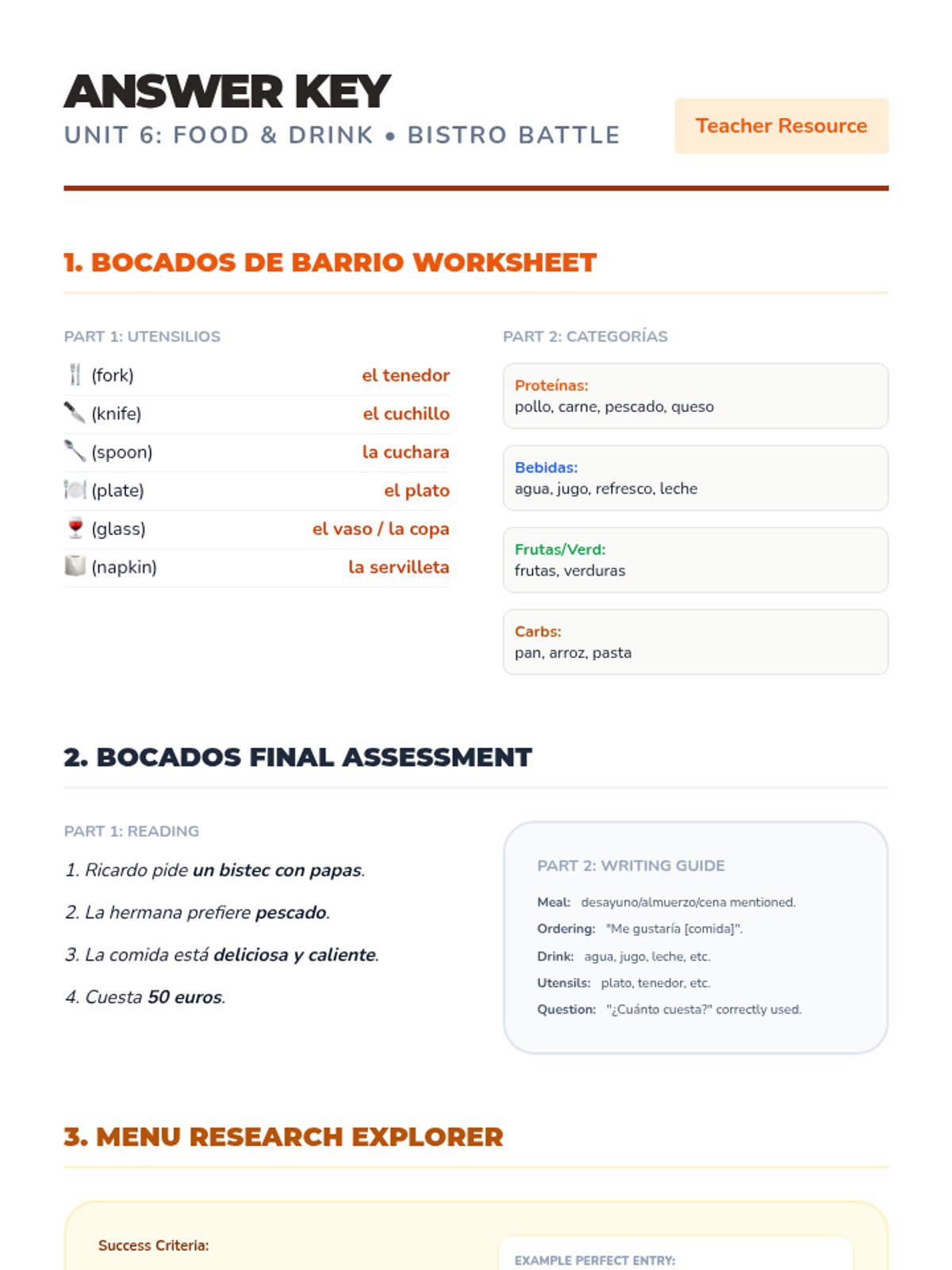 Consolidated answer key for the Unit 6 (Food and Drink) materials. Provides specific answers for the introductory worksheet and final assessment, plus a grading rubric and example responses for the menu research activity. Updated with improved formatting.