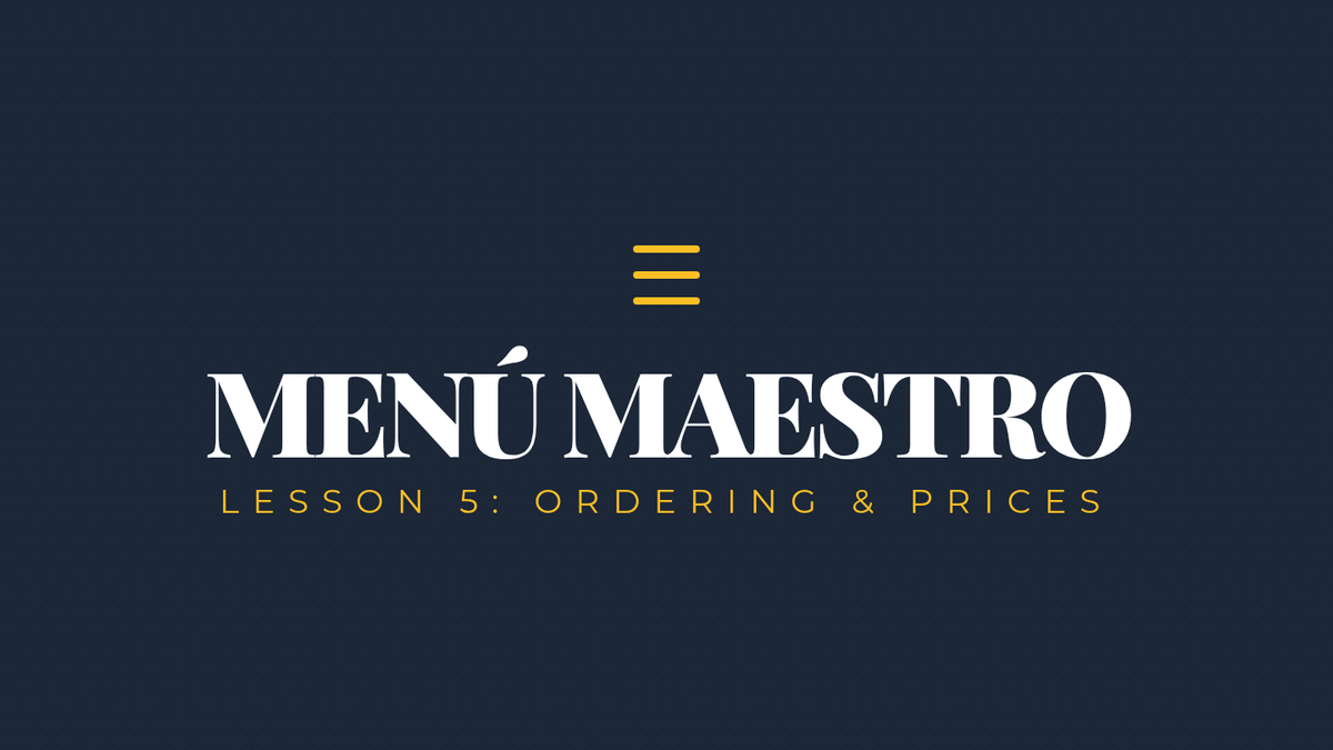 Presentation for Lesson 5 covering ordering phrases (Me gustaría, Quisiera), asking about prices (¿Cuánto cuesta?), the 'del' contraction, and an introduction to Spanish tapas culture.