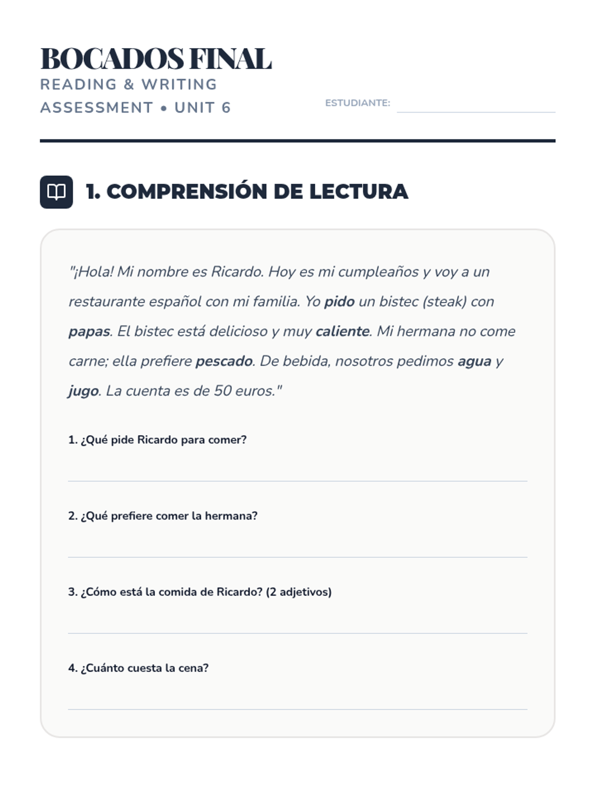 Final reading and writing assessment for Unit 6. Updated with improved answer line spacing and clearer writing prompts.