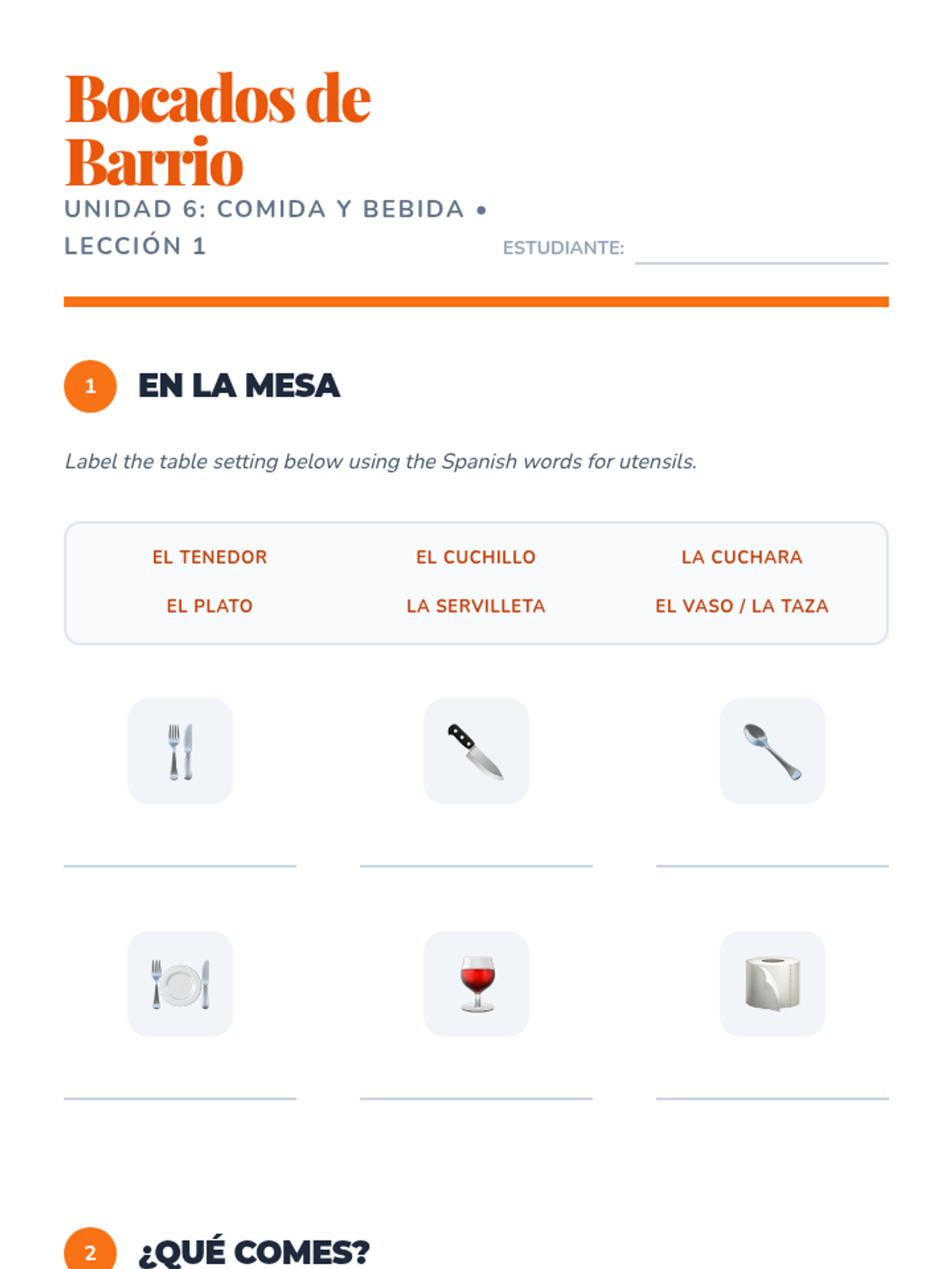 Student worksheet for Lesson 1 involving vocabulary labeling for community places, present tense verb conjugation in context, and a logical matching activity.
