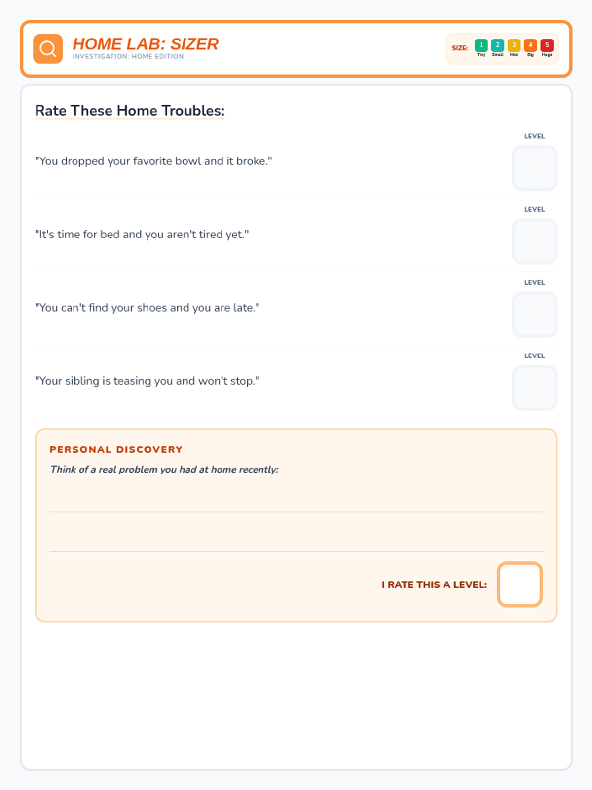 A worksheet specifically for identifying and rating problem sizes in a home setting, helping students apply their skills outside the classroom, with consistent rating box sizes and an improved scale legend.