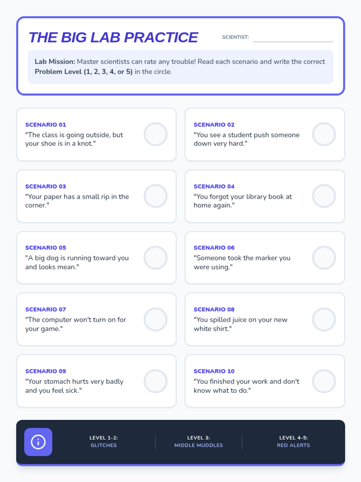An additional practice worksheet with 10 scenarios for students to rate from Level 1 to 5, providing extra reinforcement of problem-sizing skills.