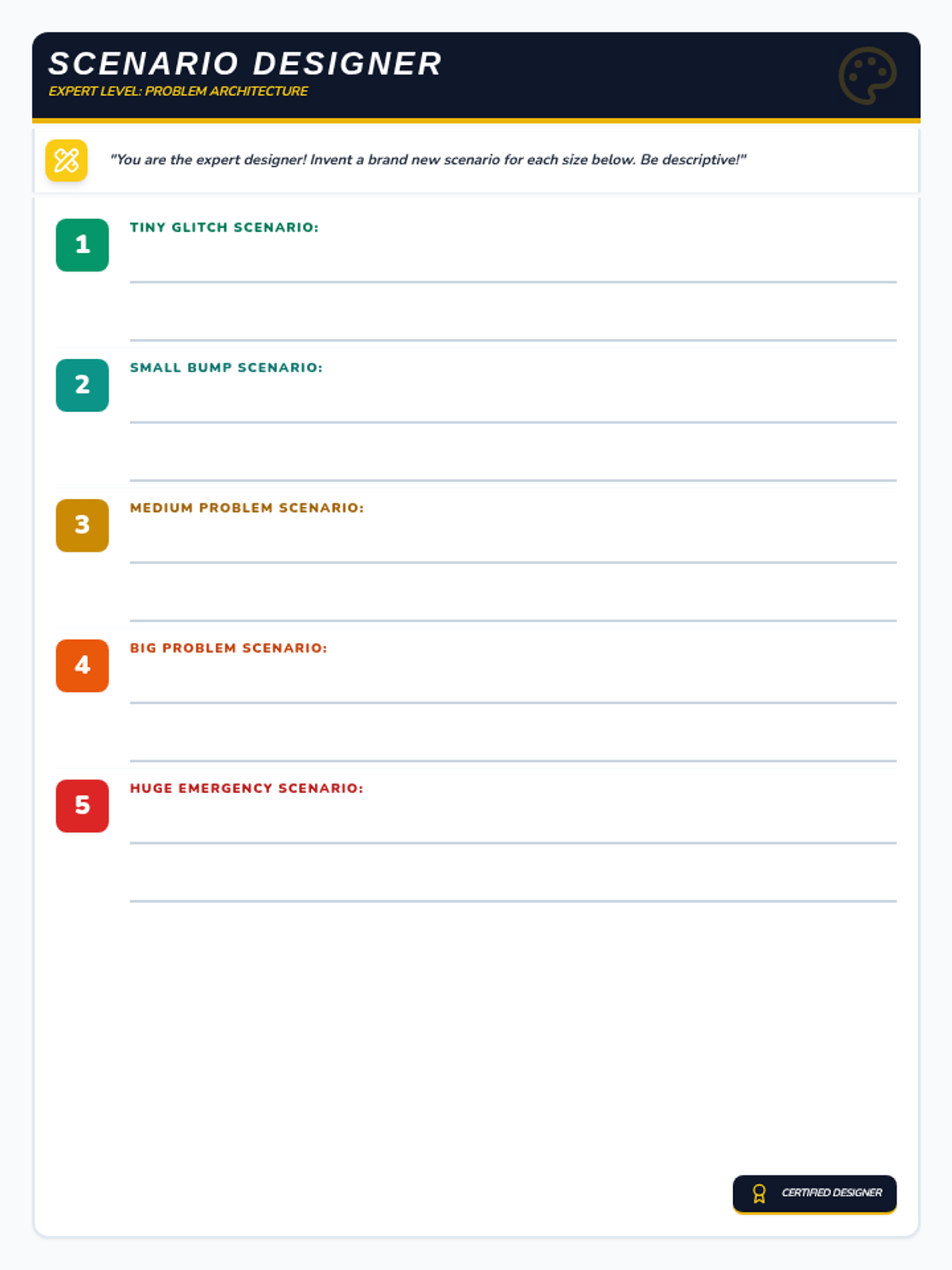A worksheet where students act as 'Scenario Designers' by inventing their own problem scenarios for each of the 5 levels, demonstrating deep understanding, with darker handwriting lines and optimized line height for Grade 2.