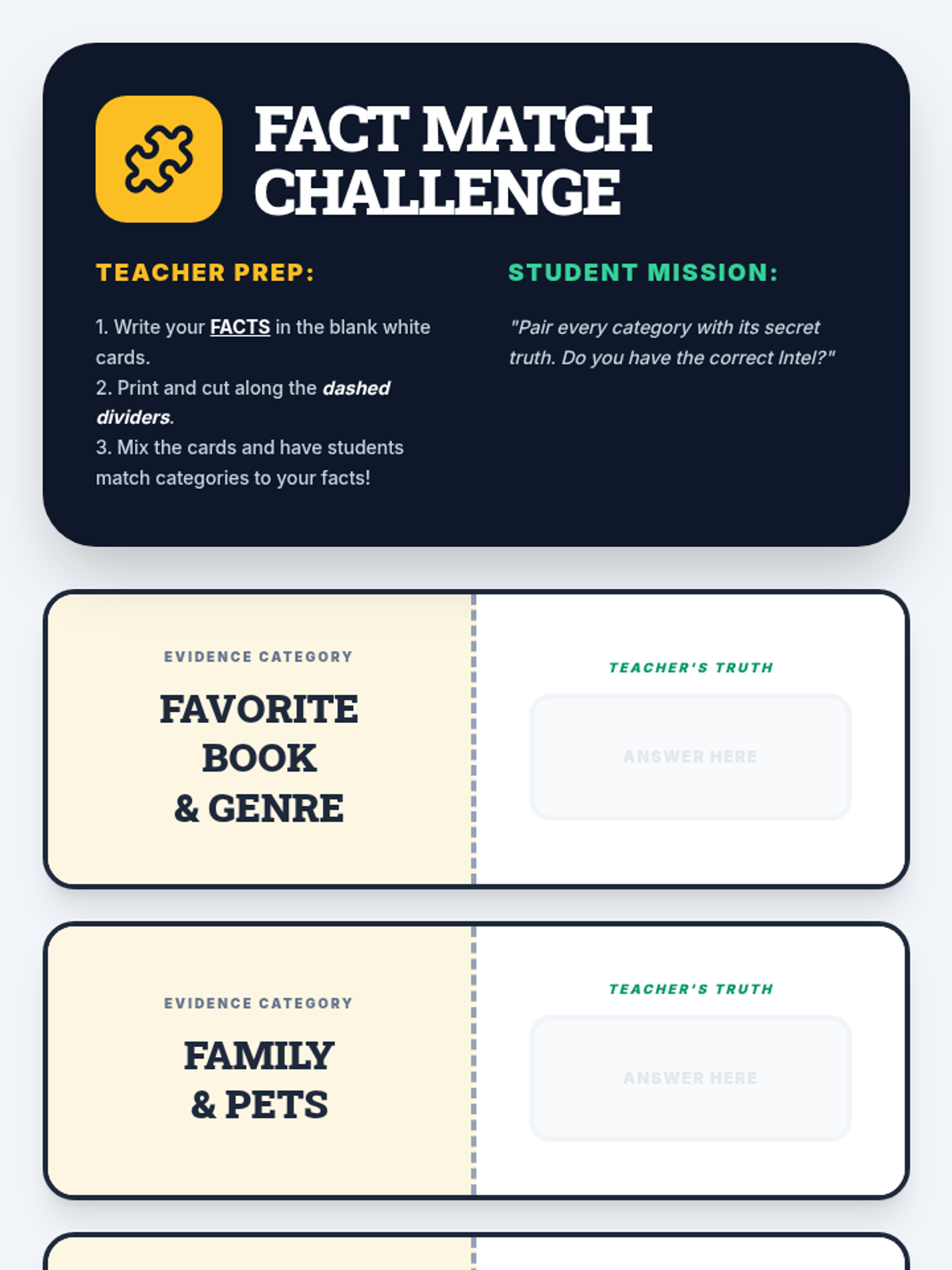 A matching game featuring 'Category' cards (e.g., Favorite Snack) and 'Fact' cards for students to match to their teacher's actual preferences.