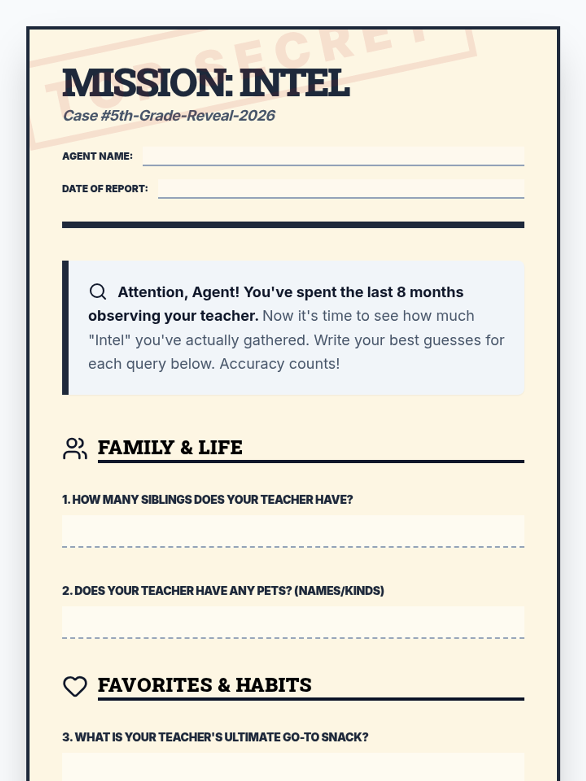 A printable trivia quiz styled as a detective dossier where students guess facts about their teacher's family, pets, hobbies, and classroom habits.