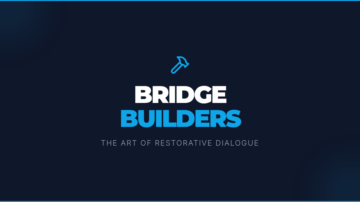 A visually engaging slide deck for classroom instruction, introducing restorative justice concepts, the 'Broken Bridge' metaphor, and the five core restorative questions.