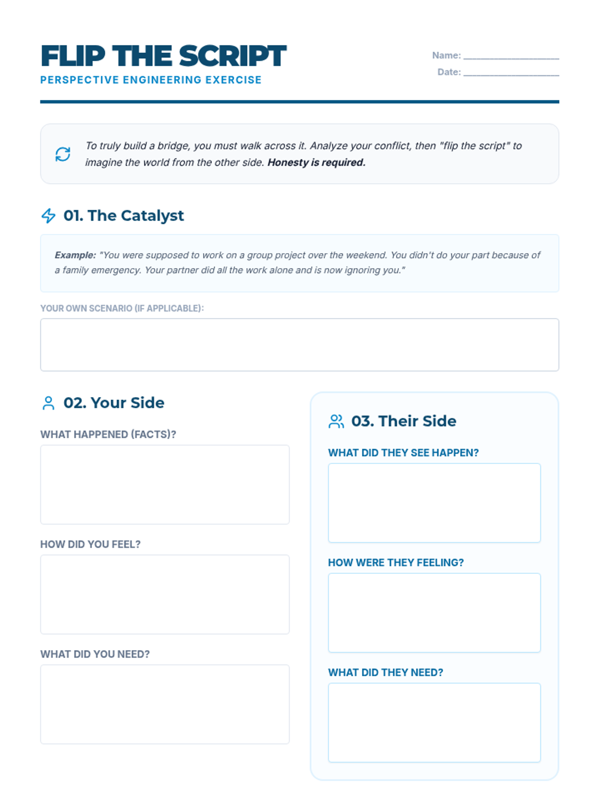 A role-reversal activity worksheet that guides students through analyzing a conflict from their own perspective and then imagining the perspective of the other person to foster empathy.