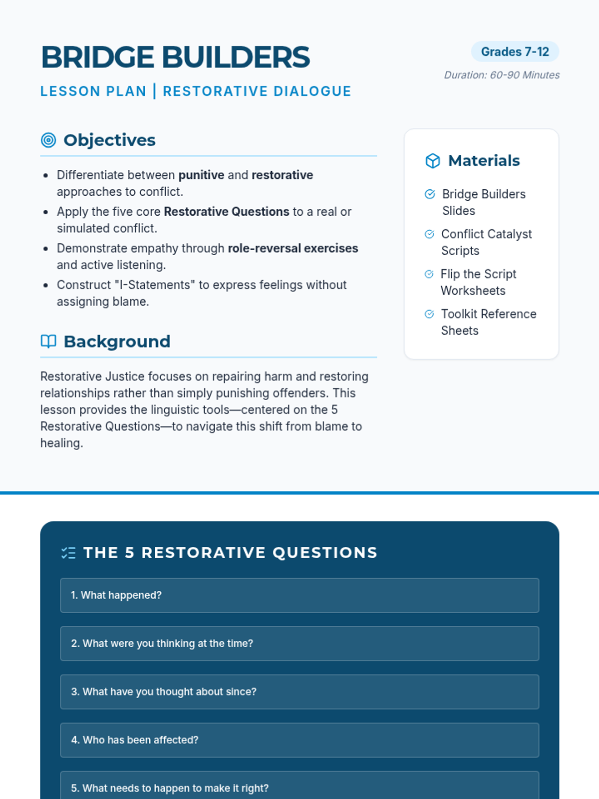 A detailed lesson plan for teachers, outlining the instructional flow for the Bridge Builders restorative justice lesson. Includes learning objectives, a timed delivery sequence, and differentiation strategies.