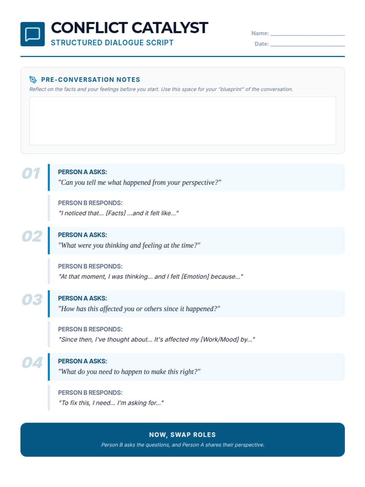 A student-facing dialogue script that provides a step-by-step structure for restorative conversations between two parties in conflict. Uses clear prompts and response stems.