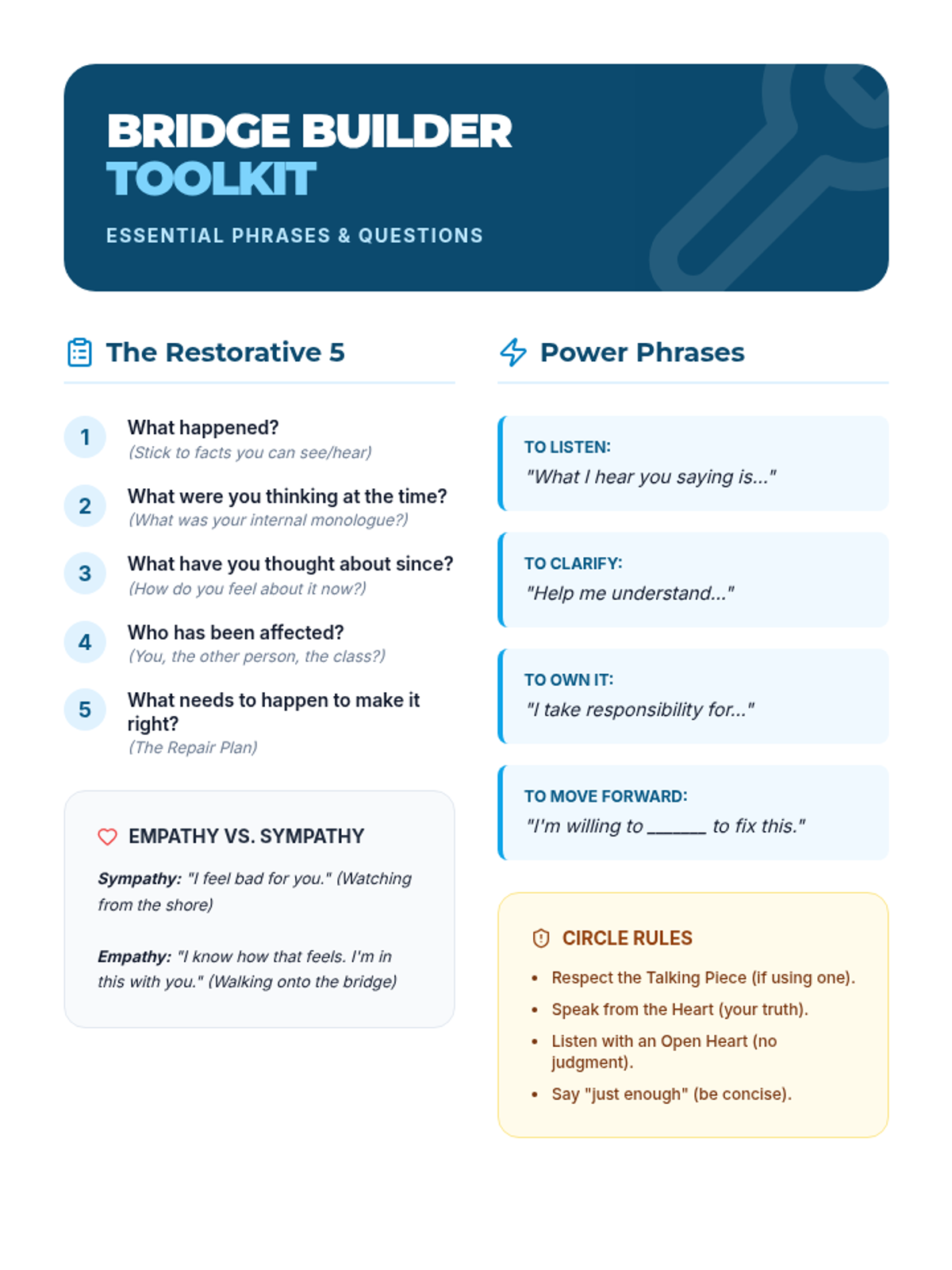 A one-page reference sheet for students, containing the 5 restorative questions, empathy vs. sympathy definitions, and 'Power Phrases' for effective communication.