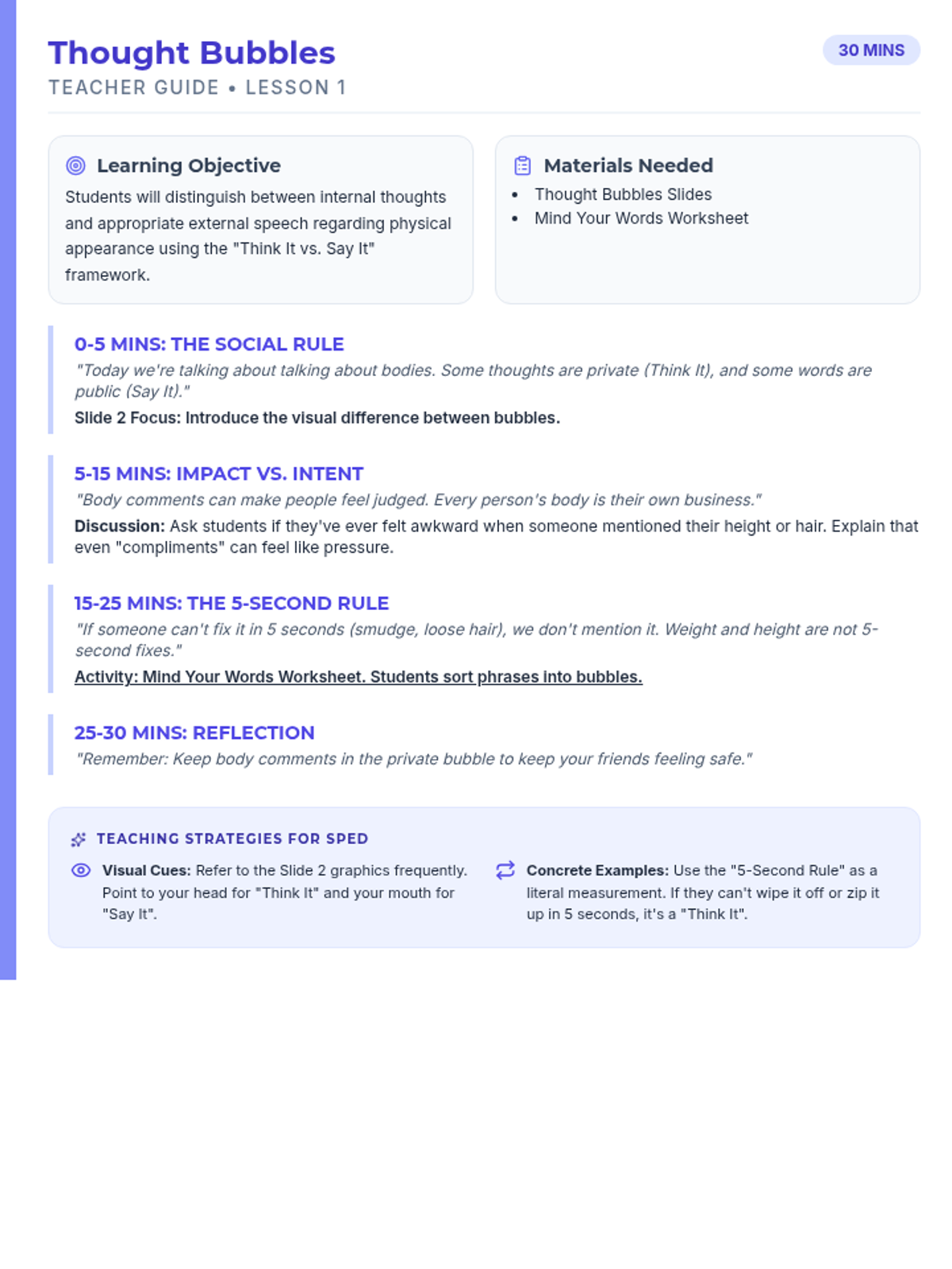 A condensed one-page teacher guide for the 'Thought Bubbles' lesson, optimized for quick reference and including specific SPED instruction strategies.