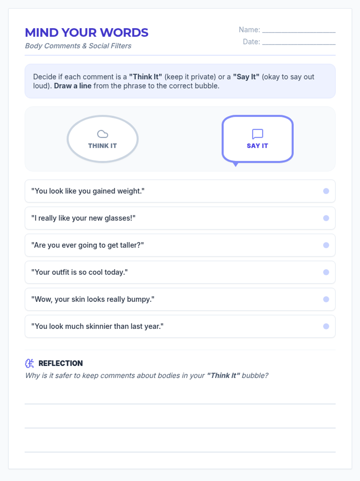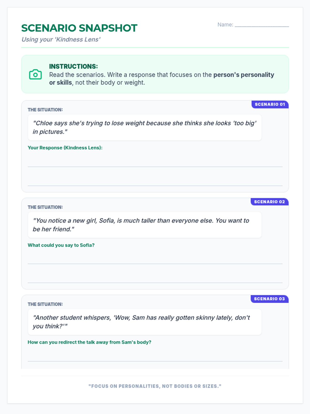 Revised Lesson 2 worksheet consolidated onto one page, featuring specific fictional names, more writing space for students, and better visual organization.