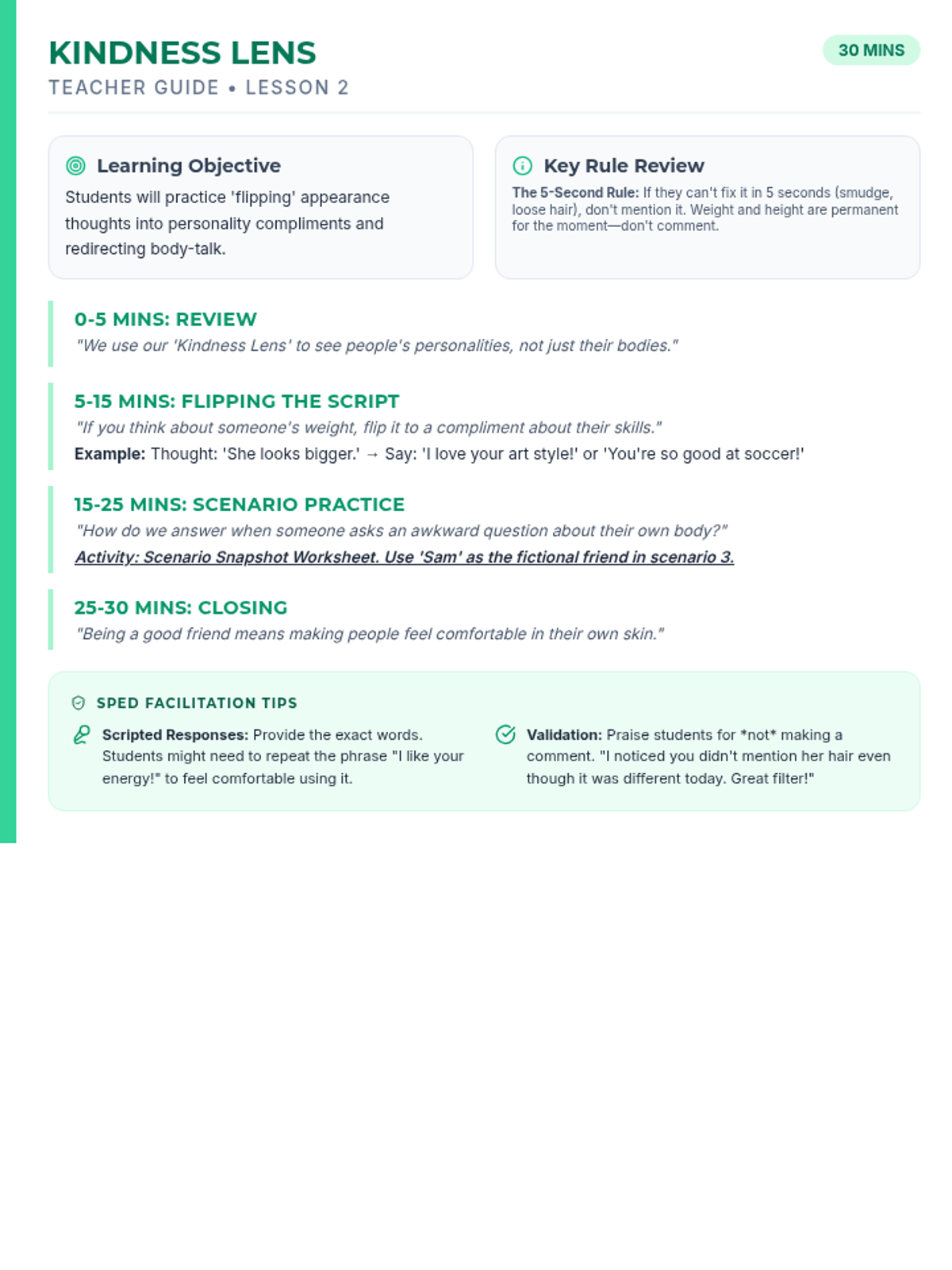 Revised Lesson 2 teacher guide consolidated onto a single page, including the '5-second rule' definition and specific SPED facilitation scripts.