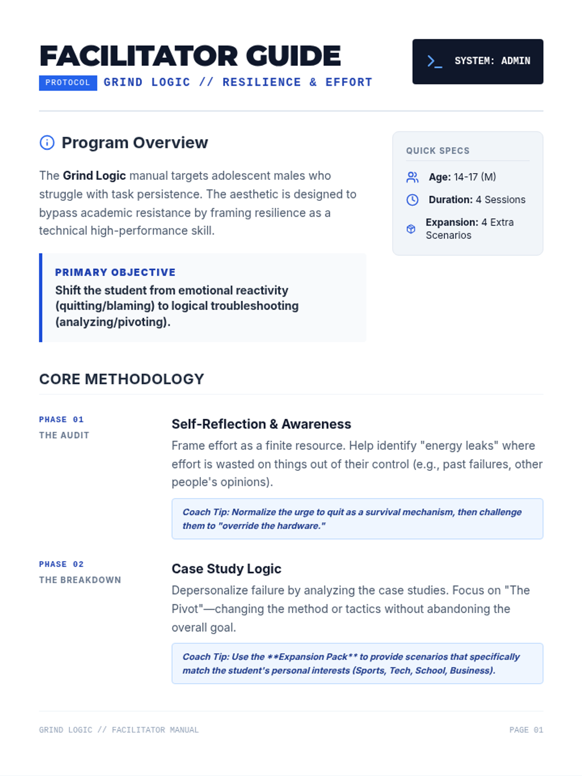 A comprehensive facilitator guide for the 'Grind Logic' program, providing instructional context, session breakdowns, implementation strategies, and discussion prompts for mentors working with teen boys on resilience and effort.