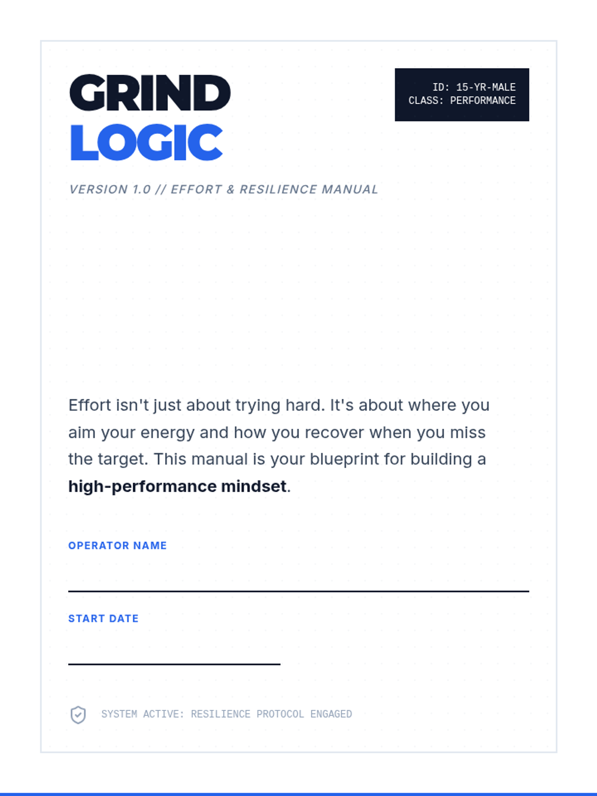 A 5-page interactive workbook designed for a 15-year-old boy, featuring an effort audit, case study analysis, action planning (The Blueprint), and a 7-day habit tracker. The design uses a modern, high-performance 'Grind Logic' aesthetic with a focus on growth mindset and resilience.