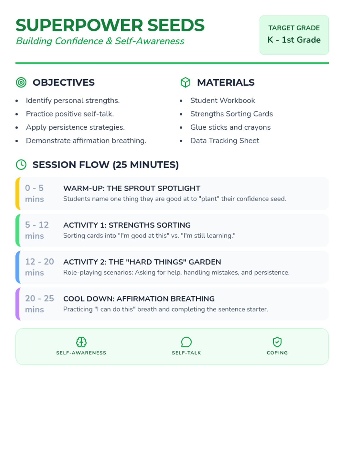 A comprehensive lesson plan overview for a K-1st grade social skills session on building confidence, including objectives, materials, and a timed 25-minute sequence.