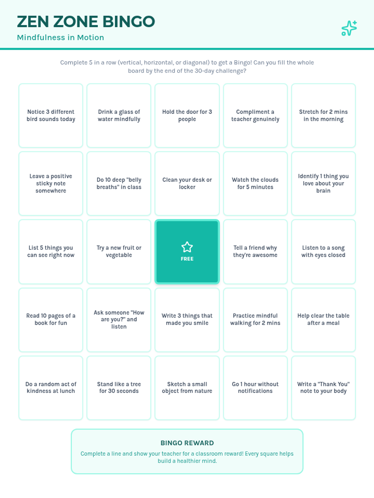 A classroom bingo card featuring 24 unique mindfulness and wellness activities. Encourages students to engage in positive habits during the school day in a gamified format. Optimized for single-page use.