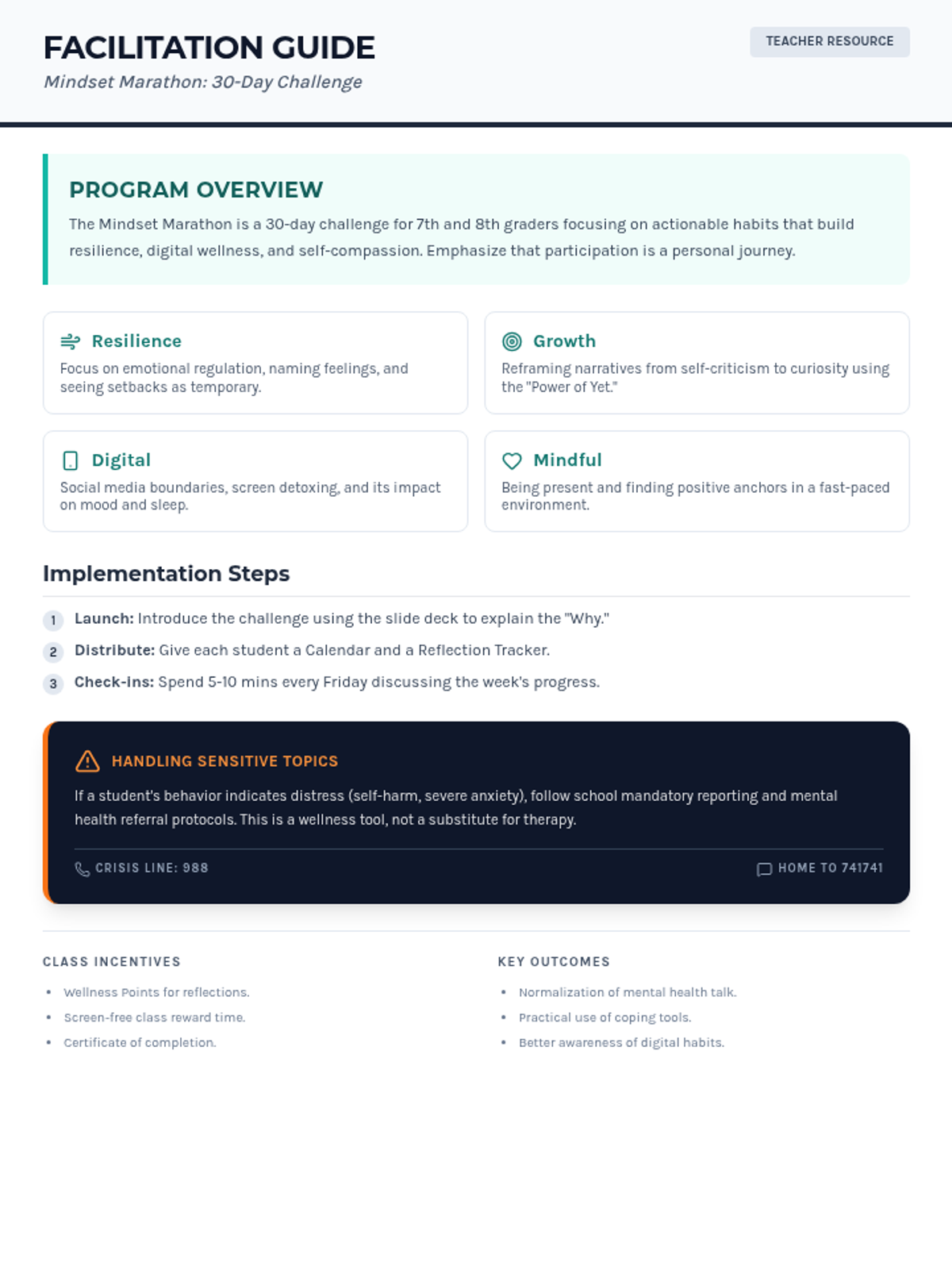 A comprehensive teacher facilitation guide for the Mindset Marathon challenge. It includes program goals, pillar definitions, implementation steps, advice on handling sensitive mental health topics, and incentive ideas.