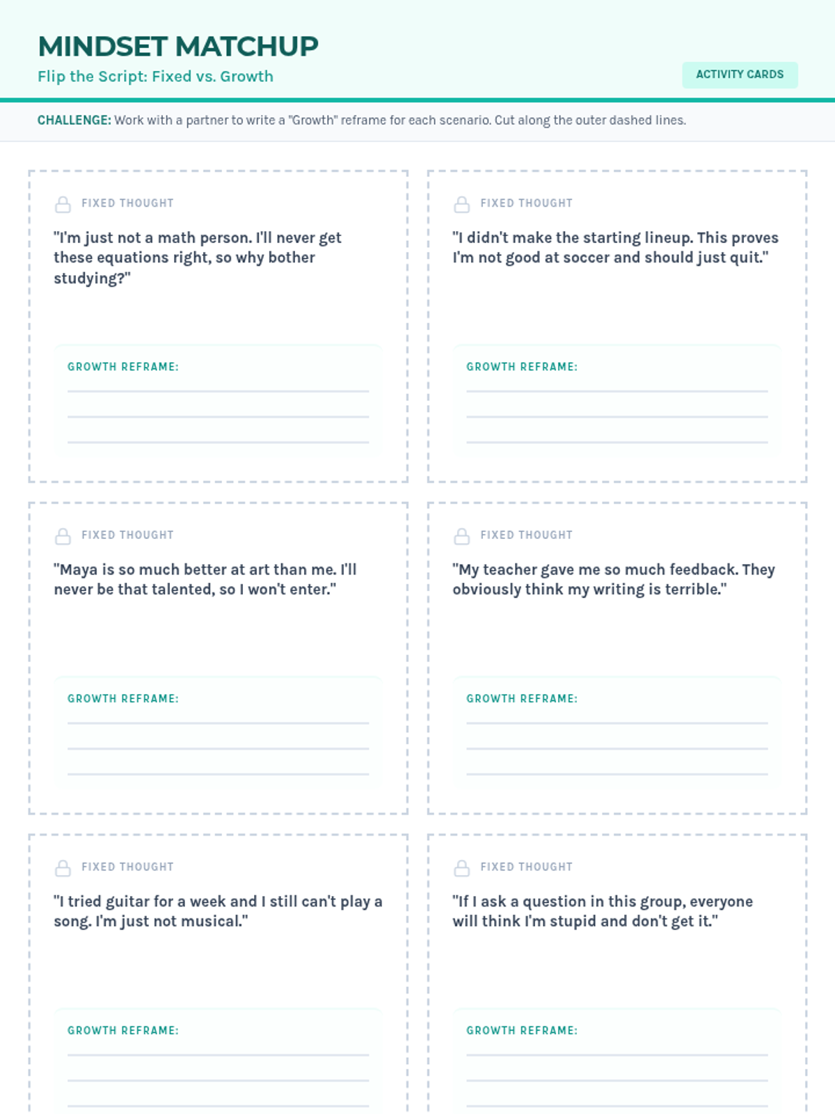 Interactive scenario cards where students practice reframing 'fixed' mindset thoughts into 'growth' mindset ones. Includes six distinct scenarios relevant to middle school life with improved writing space.