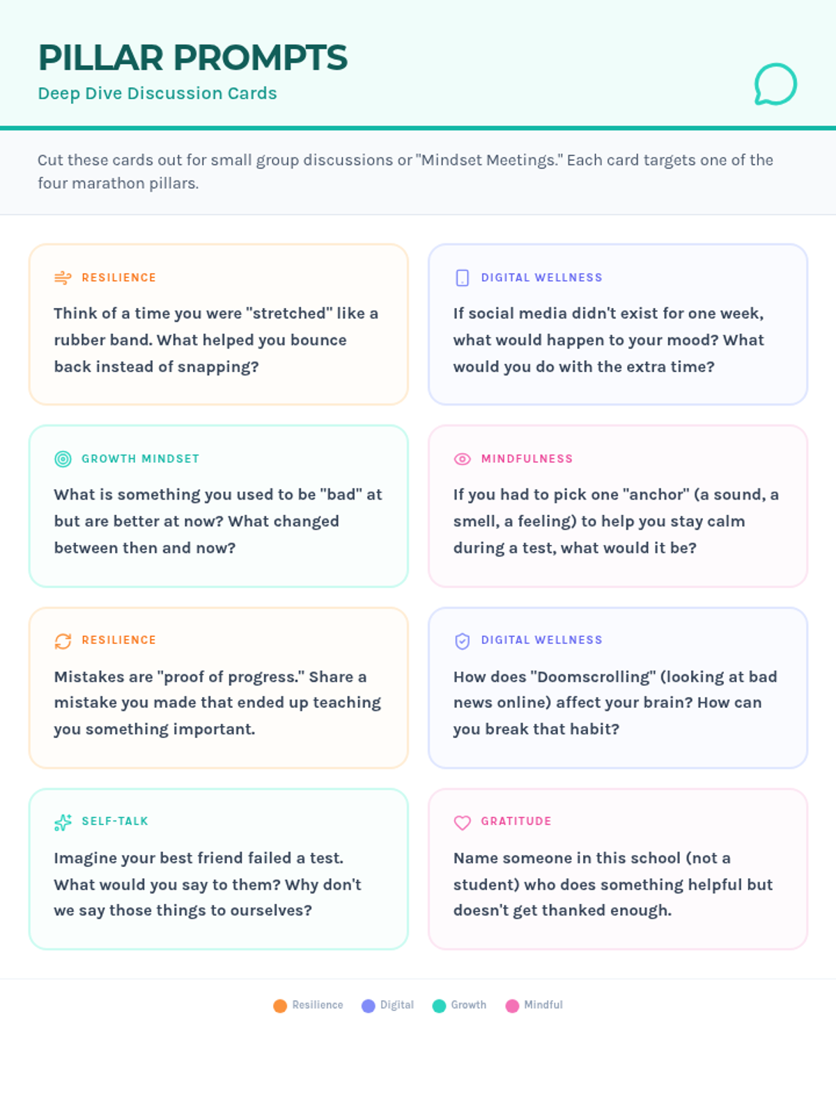 A set of 8 printable discussion cards designed for small group or classroom conversations. Each card addresses one of the four mental health pillars with deep-dive prompts.