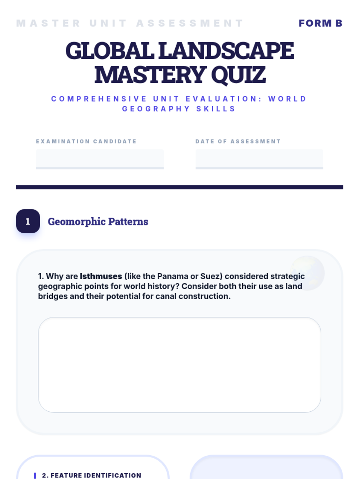 Global-focused final mastery quiz (Form B) featuring questions on isthmuses, world elevation averages, and regional economic advantages. Part of a secondary assessment set.