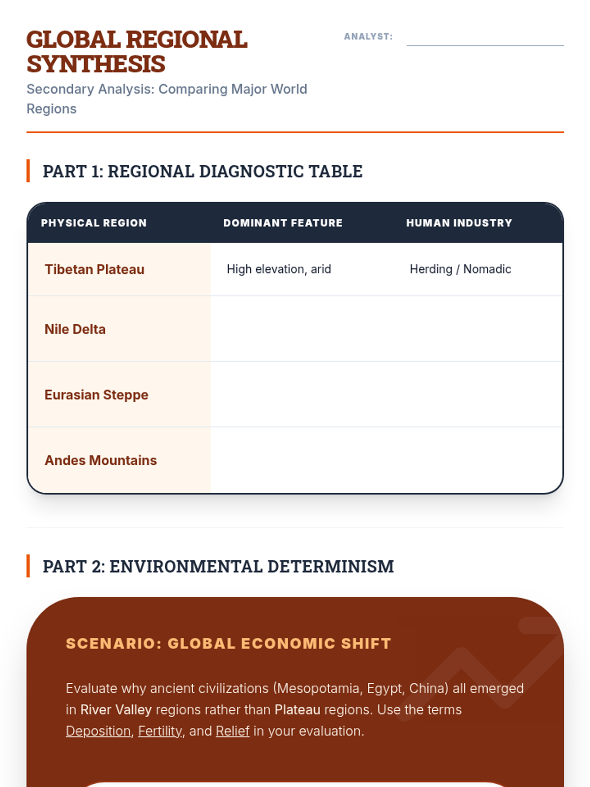 Secondary worksheet for Lesson 4 focusing on global regional diagnostics and the socio-economic analysis of river valleys vs. plateaus.